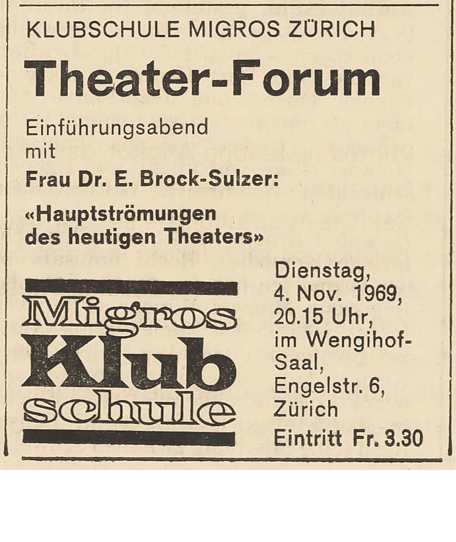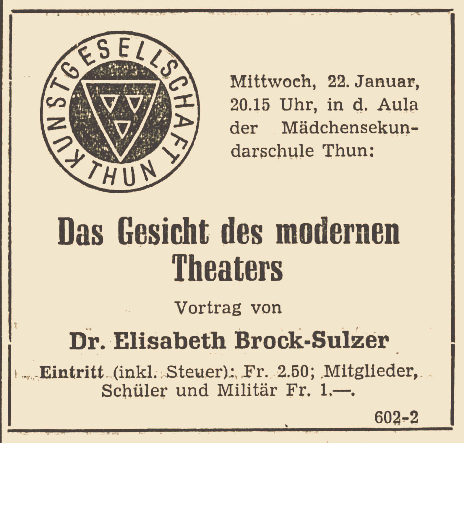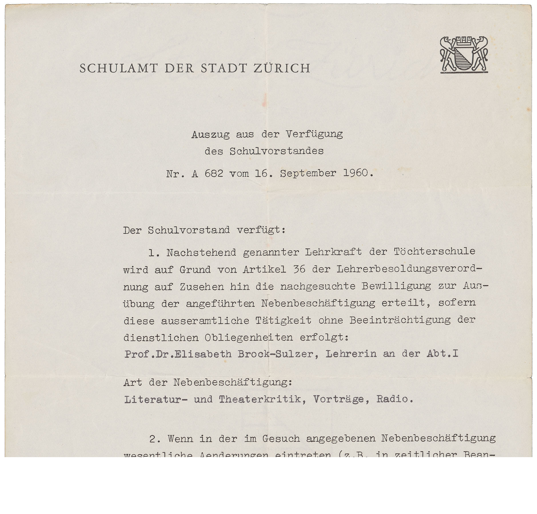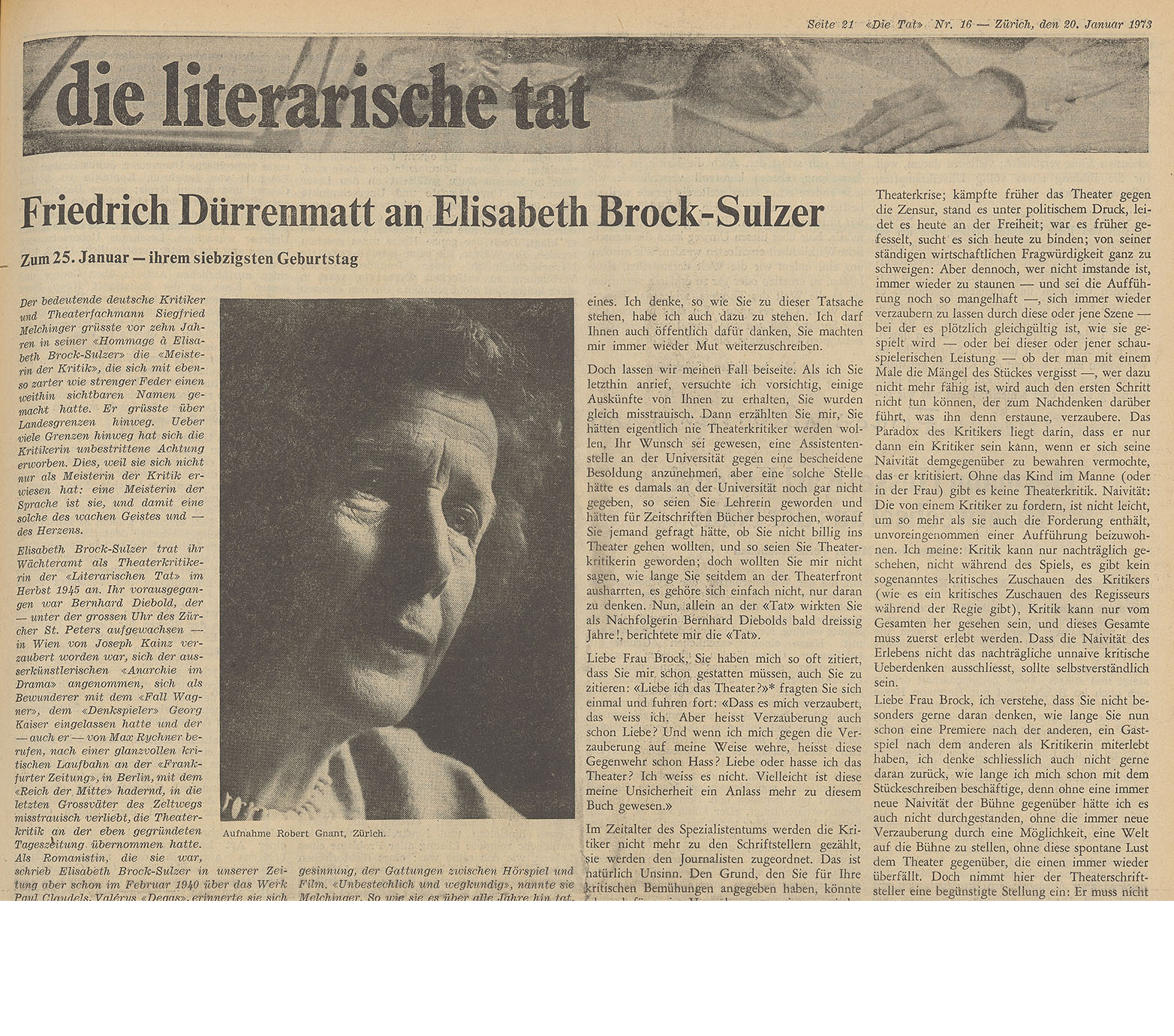 Zwischen 1945 und 1977 schreibt sie mindestens 1‘500 Kritiken, so die vorsichtige Schätzung aus den überlieferten Belegen im Nachlass. Im Durchschnitt bedeutet das: ungefähr eine Kritik pro Woche. Das klingt bescheiden. Doch Brock-Sulzer unterrichtet weiter an der Töchterschule, während sie für Zeitungen und Zeitschriften im In- und Ausland rezensiert und Essays beisteuert – etwa für die «Basler Nachrichten» oder die «Frankfurter Allgemeine Zeitung»; für «Akzente», «Hochland» oder «Theater heute».