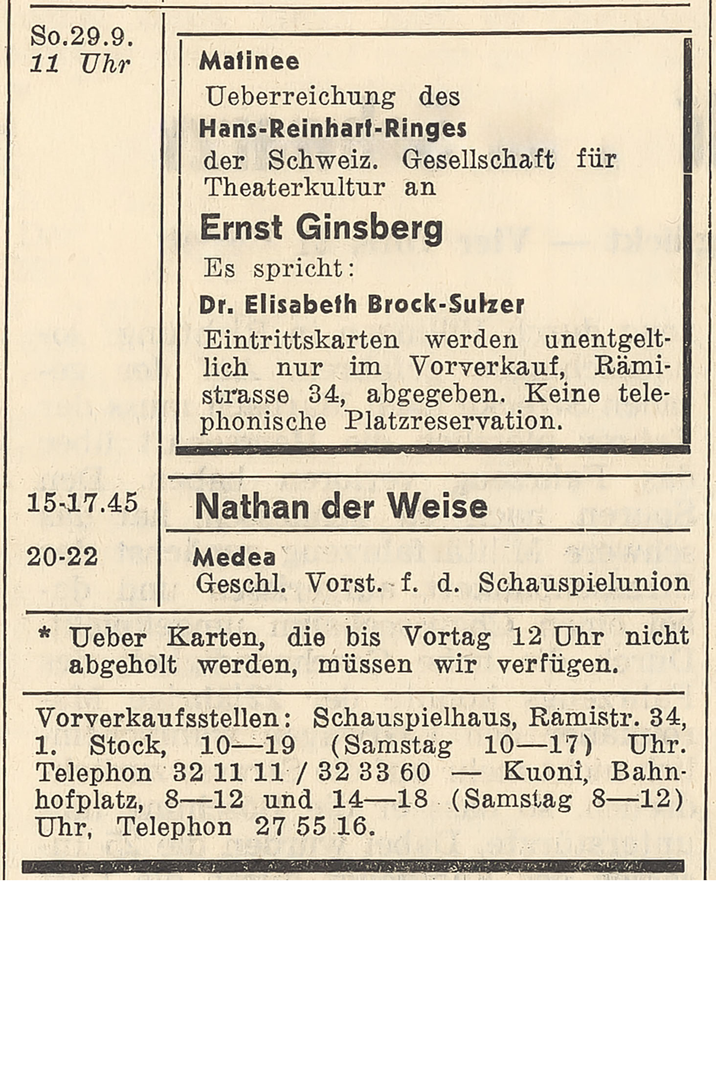 Und noch ein zweiter Name ist mit dem ihren eng verbunden, der des Schauspielers Ernst Ginsberg, der 1933 aus Deutschland emigriert und unter dem Dramaturgen Kurt Hirschfeld ein Engagement am Schauspielhaus Zürich findet. Brock-Sulzer, die mit Ginsberg viele Briefe wechselt, widmet ihm 1963 eine Monografie in der Reihe Theater heute. Auch das Vorwort zu seinen 1965 veröffentlichten Lebenserinnerungen stammt von ihr.