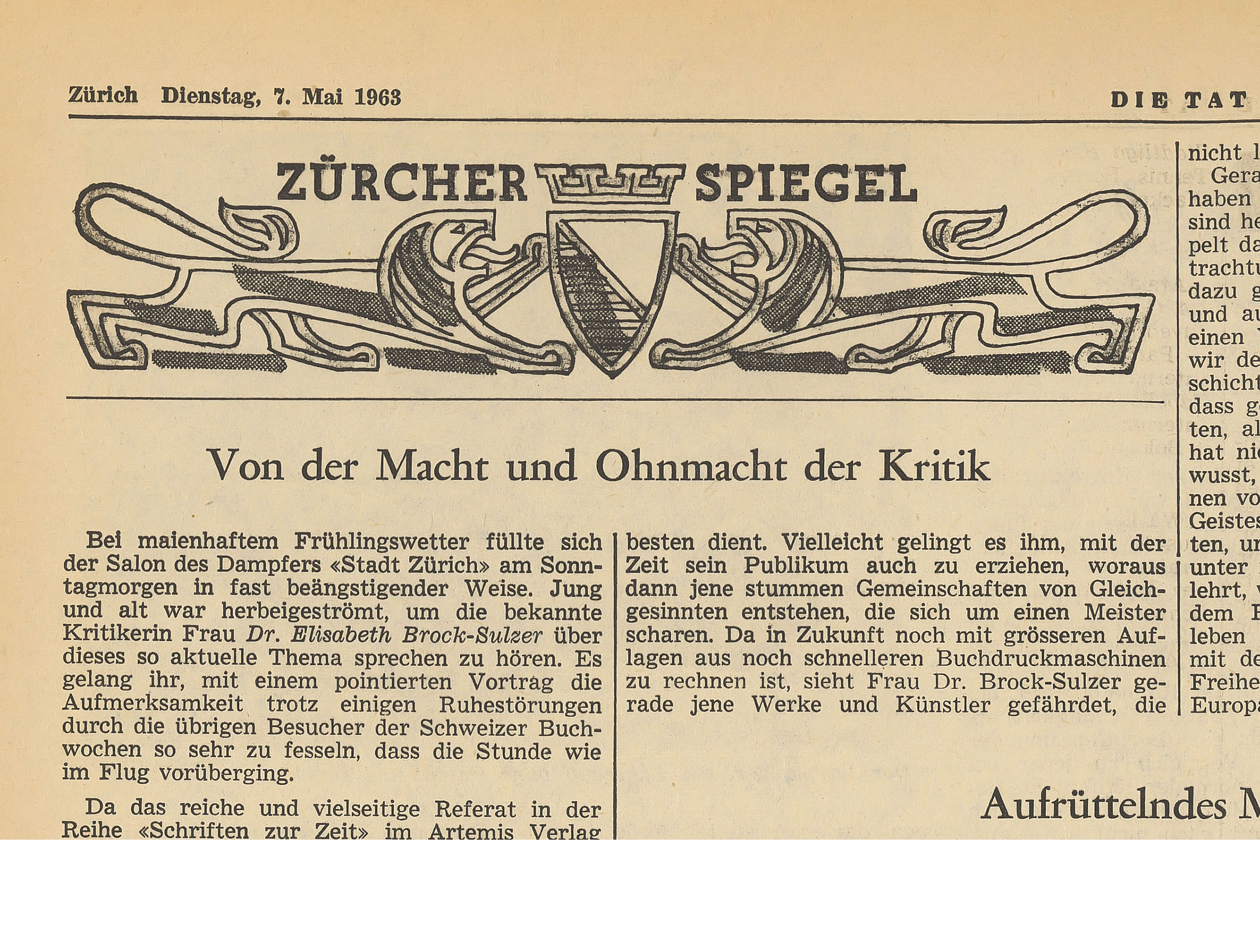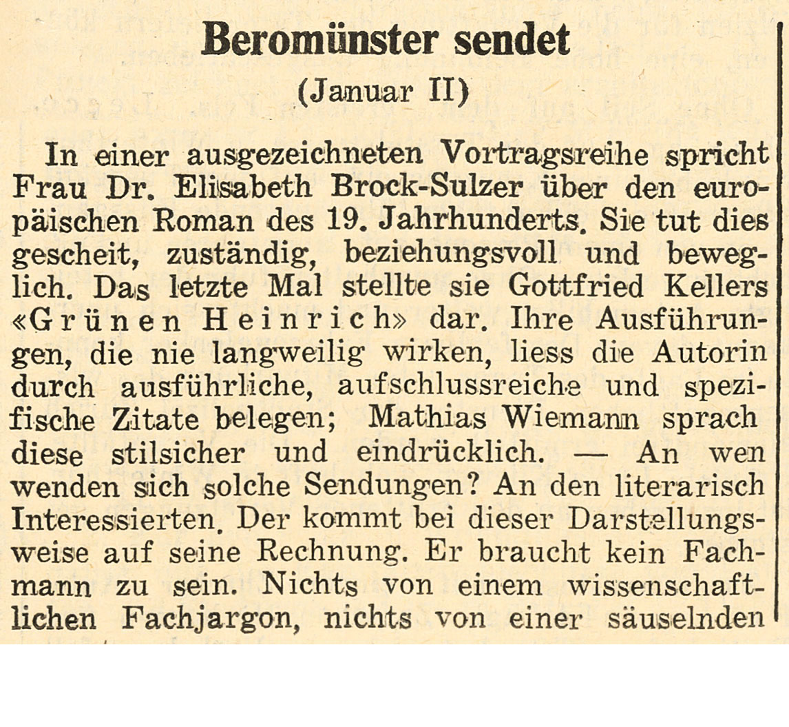 Erst auf den zweiten Blick wird das Potential deutlich: Elisabeth Brock-Sulzer gehört zu den Pionierinnen des Feuilletons nach 1945. Dass ihre politischen und ästhetischen Präferenzen in kein Schema passen, macht das Fallbeispiel umso interessanter. Wenn man die begrenzten Möglichkeiten betrachtet, die Frauen in Wissenschaft und Presse nach 1945 haben, dann veranschaulichen ihre Nachlassmaterialien die beeindruckenden Spielräume, die sich Elisabeth Brock-Sulzer erschrieben hat.