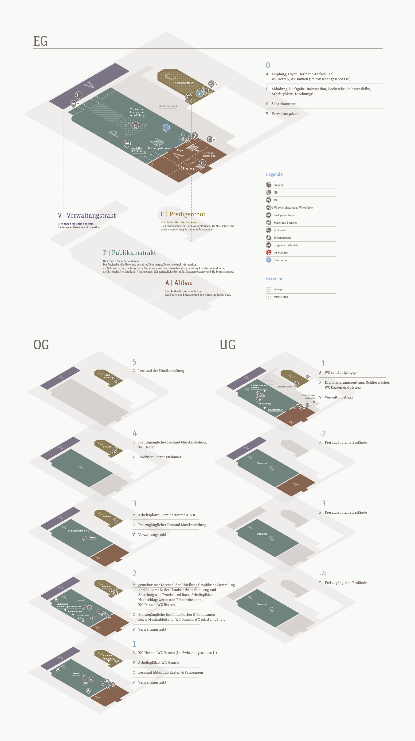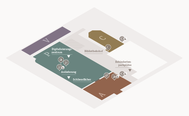 - Building part A (historic building): pickup and returns, reception, Hermann-Escher-Saal, toilets