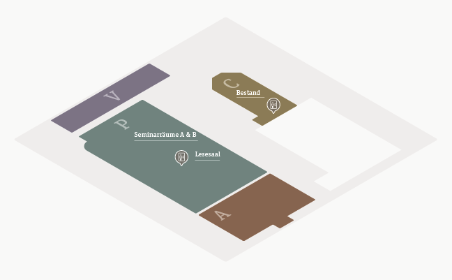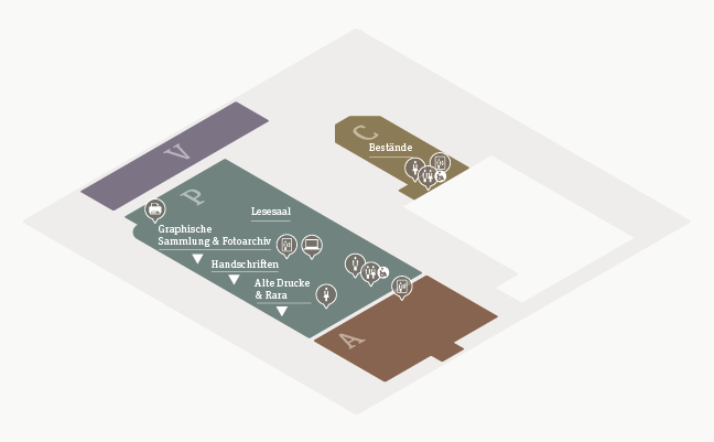- Building part C (Predigerchor): ladies toilet, wheelchair accessible toilet, freely accessible holdings of the Maps and Panoramas Department and the Music Department