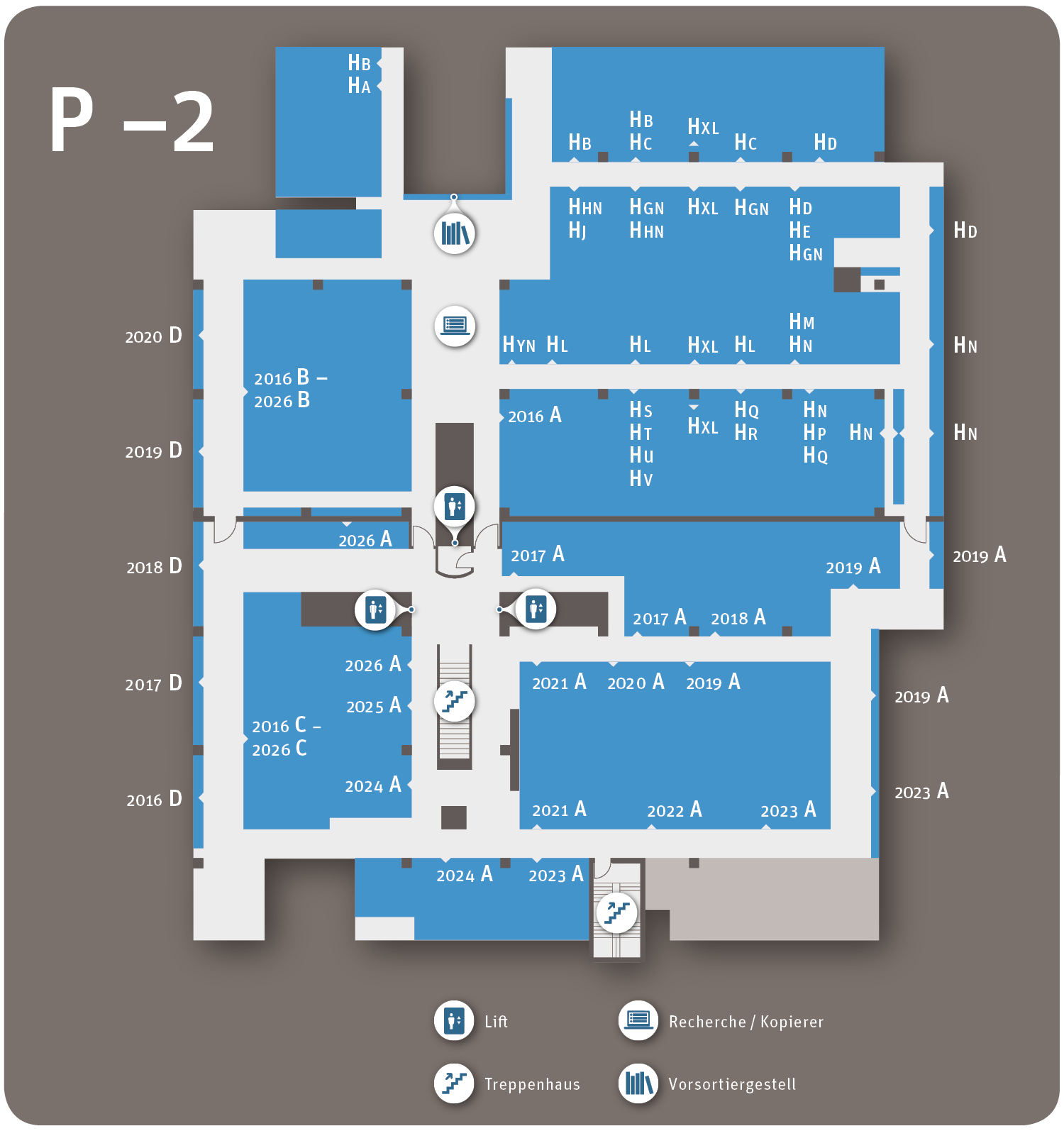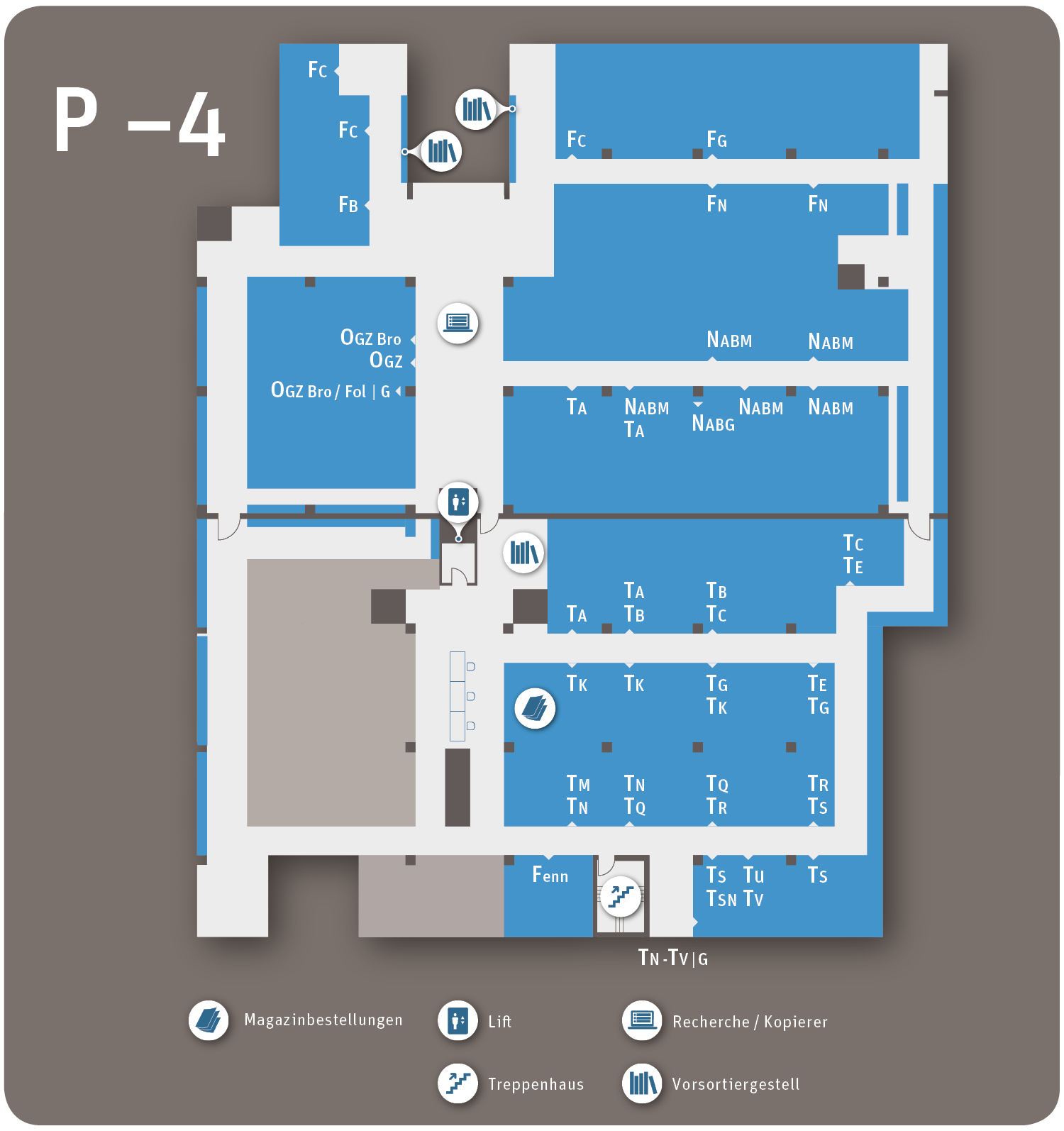 - Building part P (public area): Information, search, self-service, workplaces, reading lounge