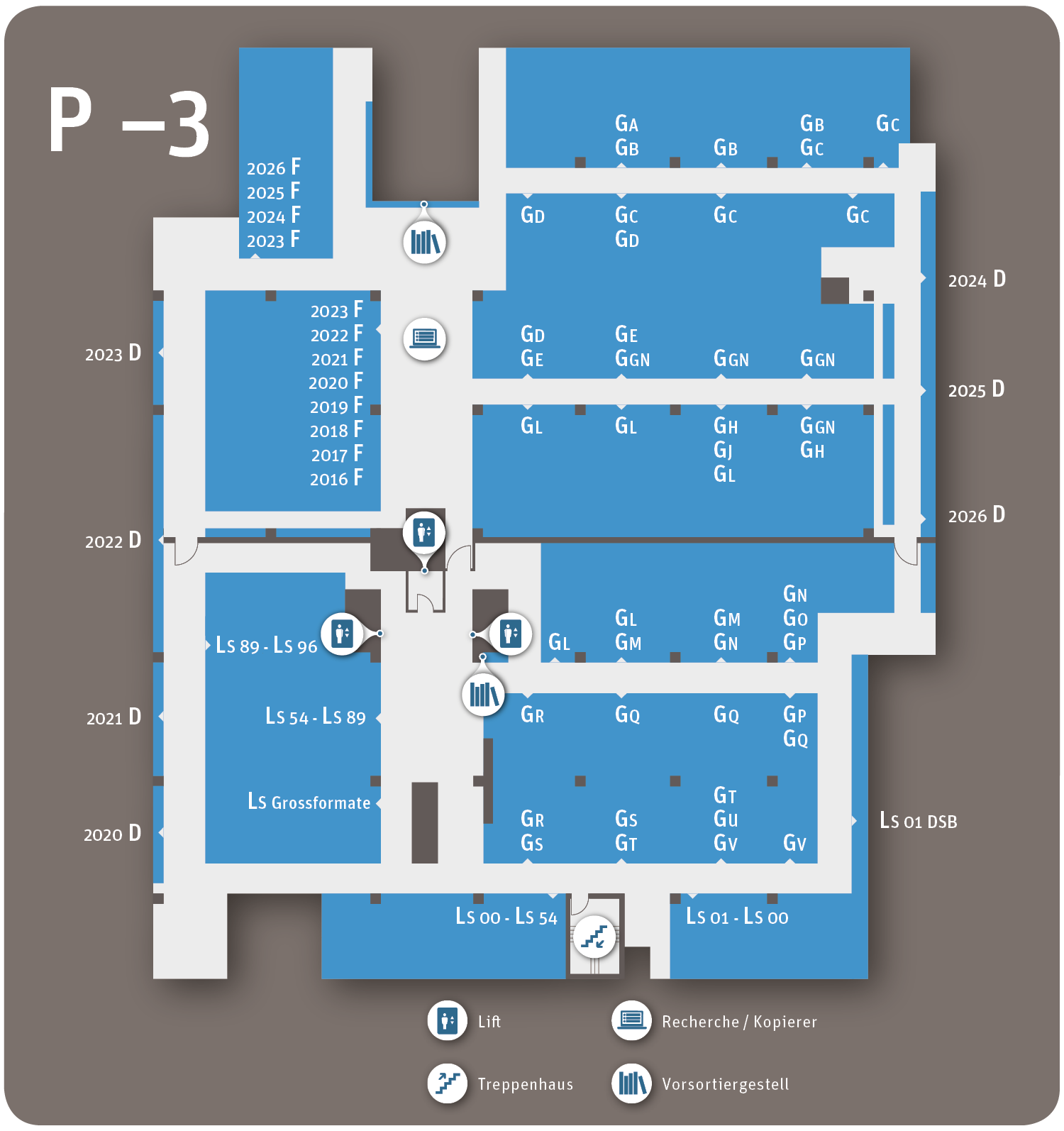 - Building part P (public area): Provisional reading room for the special collections, workstations, reference works and reference collection, ladies' WC, men's WC